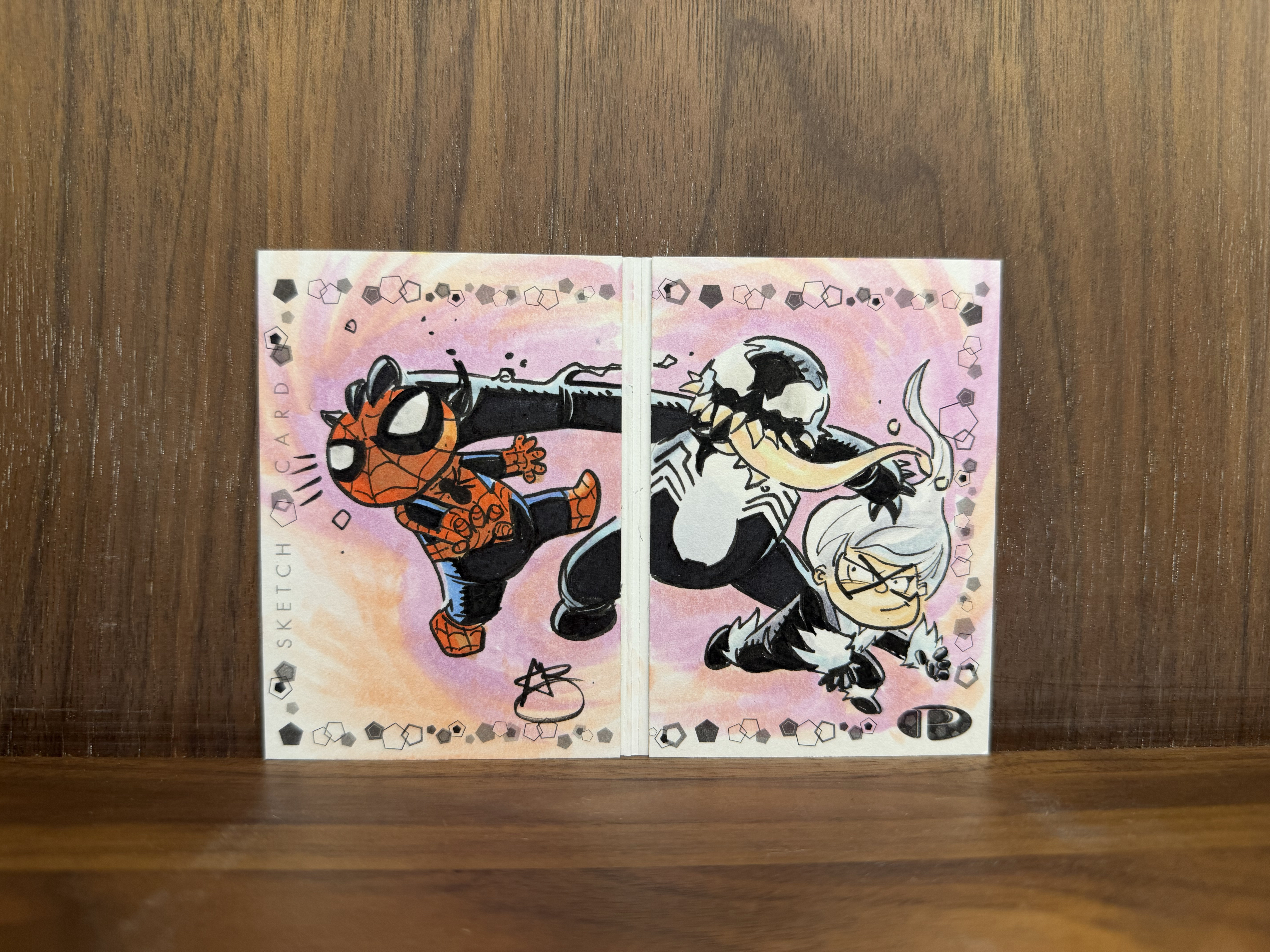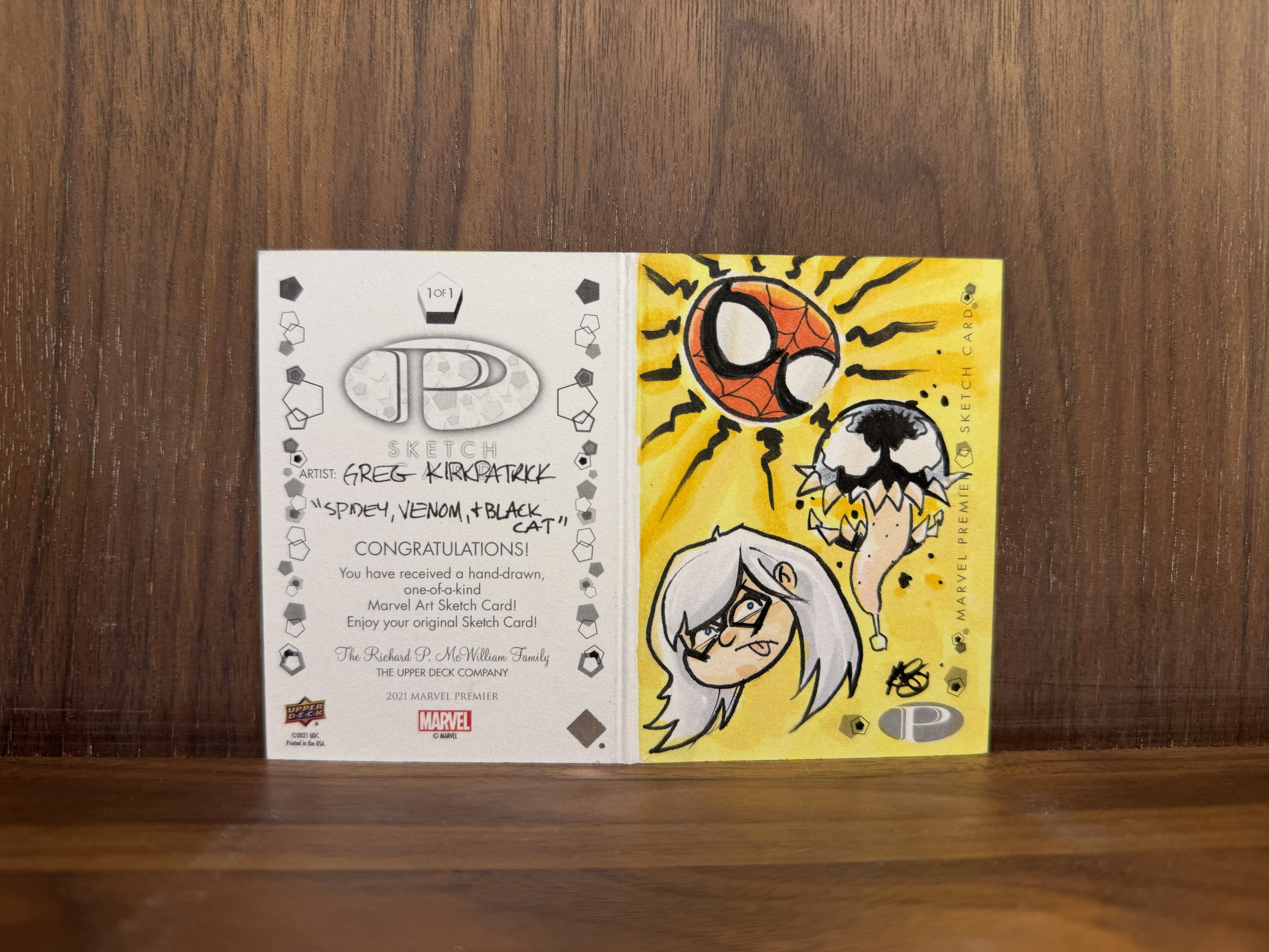 2021 Upper Deck Marvel (MCU) 多角色 Premier大铁盒系列,Sketch Card 手绘卡,画师Greg Kirkpatrick 1/1,蜘蛛侠毒液黑猫
